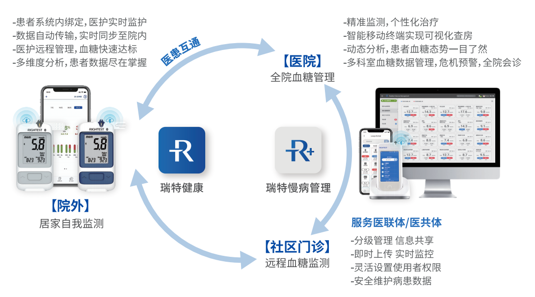 医护端工具:包括瑞特慢病管理APP与瑞特全院血糖管理小程序,提供高低血糖预警、患者照护区管理、多维度数据分析、在线随访留言、移动查房等功能,助力医护人员高效开展诊疗工作。